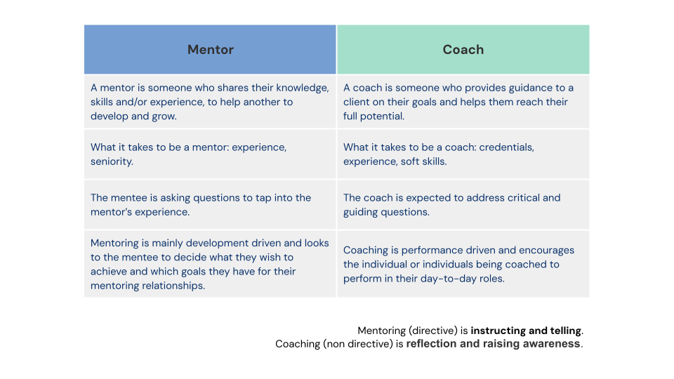 Mentors advise you and sponsors advocate for you. Mentoring (directive) is instructing and telling. Coaching (non-directive) is the reflection and raising awareness.