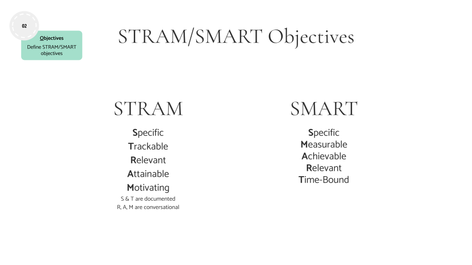 The objectives could be set by using the STRAM or SMART approach.